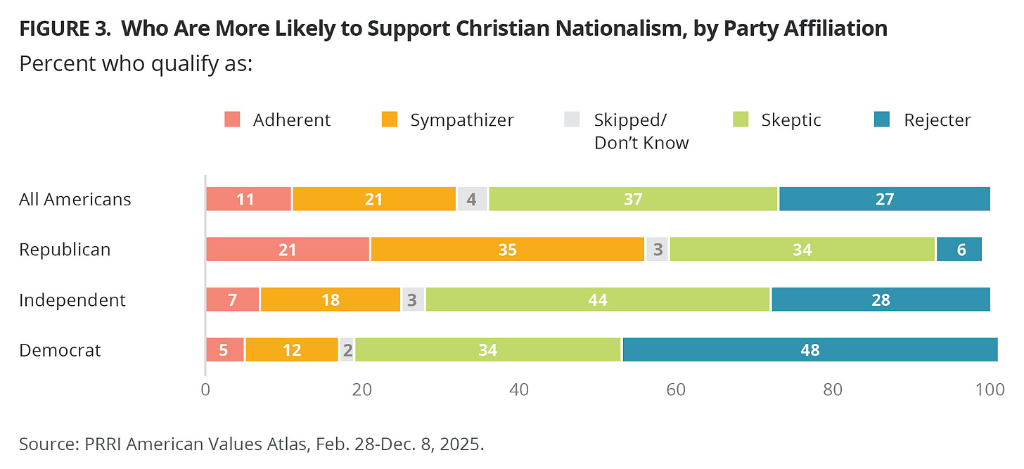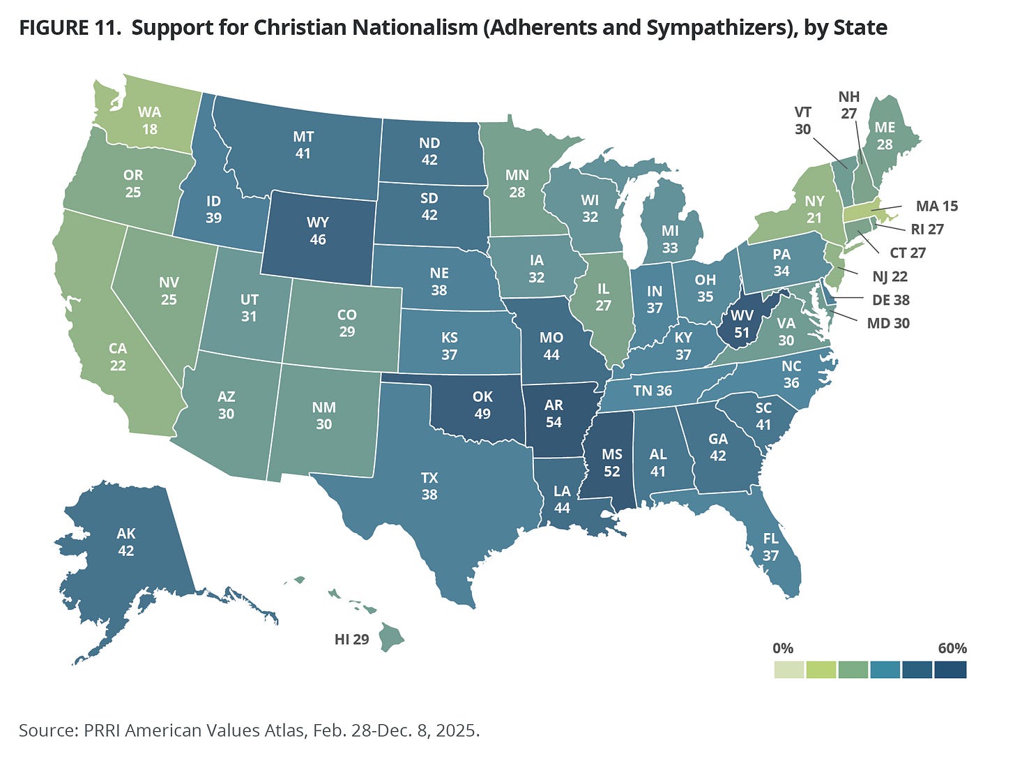 WASHINGTON (February 17, 2026) — One year into the second Trump administration, a new national survey released today by PRRI examines support for Christian nationalism across all 50 states. At the national level, a majority of Republicans (56%) qualify as either Christian nationalism Adherents (21%) or Sympathizers (35%), compared with one in four independents (25%) and less than one in five Democrats (17%).