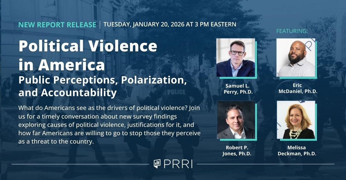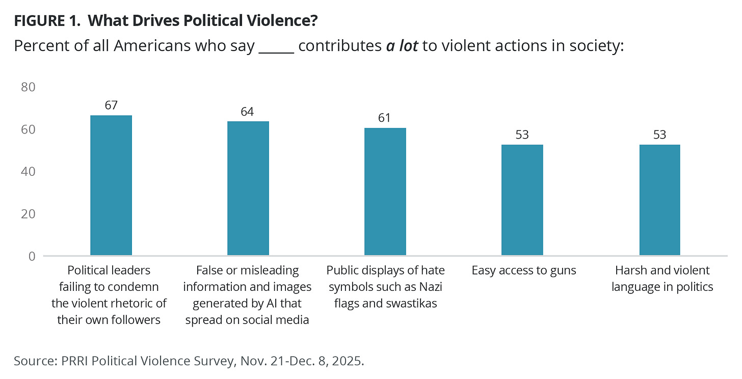 WASHINGTON (January 16, 2026) — A new national survey released today by PRRI finds that two-thirds of Americans (67%) believe political leaders’ failure to condemn violent rhetoric contributes a lot to violent actions in society. Democrats are 20 percentage points more likely than Republicans to agree that the failure of political leaders to condemn violent rhetoric contributes to violent actions in society (80% vs. 60%).